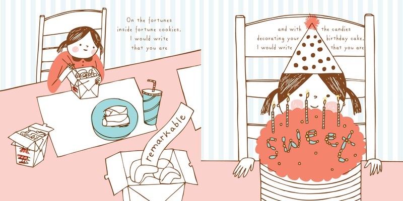 If I wrote a book about you and how wonderful you are, I would write it everywhere,” says a mother to her child. And so she does—with the branches of the trees, the sand at the beach, and even the rays of the sun. Children will enjoy searching out the words