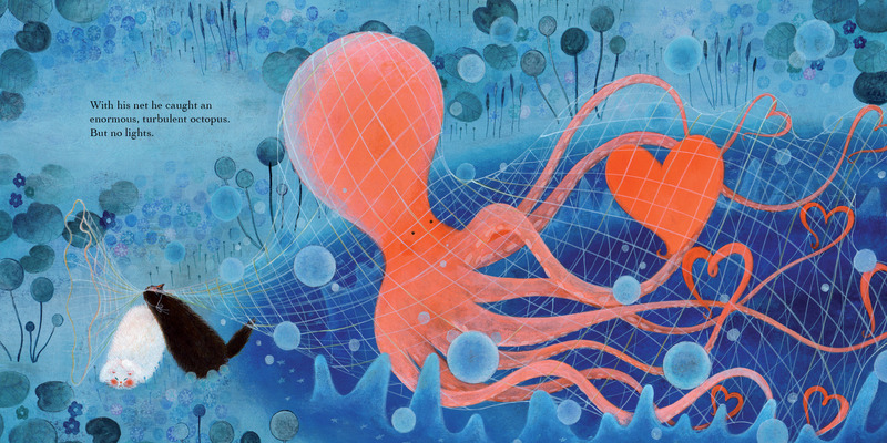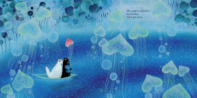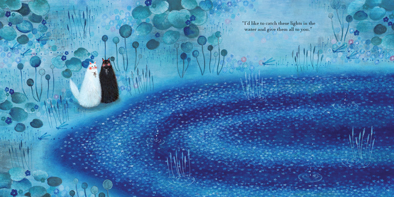 Two cats take an evening walk along the banks of a lake. The black cat wants to catch the mysterious lights that shine in the water, to give as a gift to the white cat. But he can’t seem to grasp them, no matter how hard he tries. Can the white cat help to show him that the perfect gift isn’t important, when his efforts have already captured her heart?